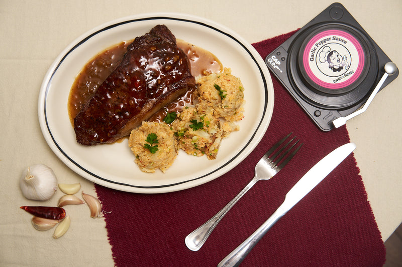- Plate it up - Spoon the sauce onto the plate first, place the steak on top, and finish with a scoop of Garlic Pepper Sauce. Serve the crispy mashed potatoes on the side.